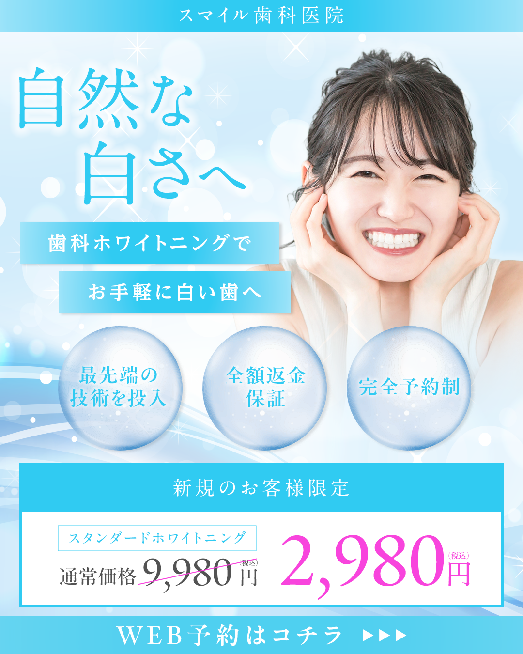 歯科ホワイトニングの新規集客を目的に制作したバナーです。清潔感と信頼感を重視し、全体をブルー系で統一することで、歯科医院らしい衛生的な印象を表現しました。